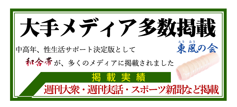 発売以降、週刊実話・週刊大衆などをはじめ様々なメディアに掲載されてきました【和合帯】 中高年の性生活サポートグッズのトップクラスのお客様満足度を頂いております。